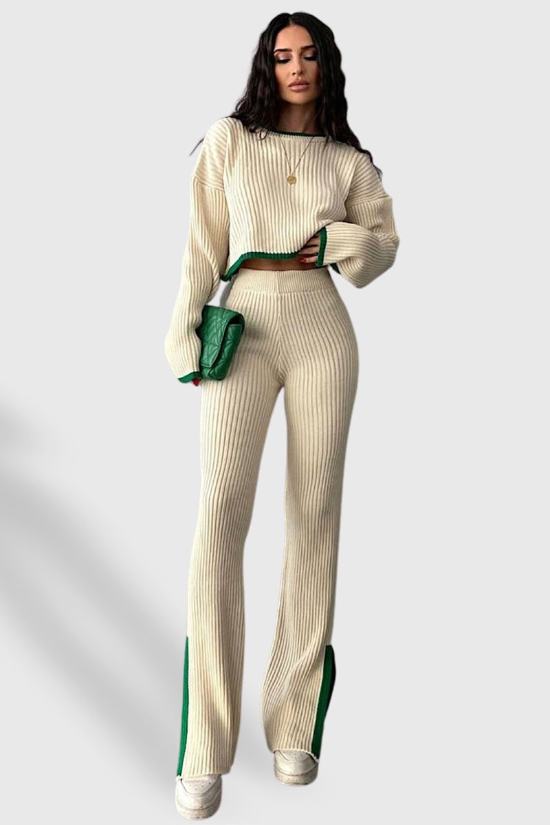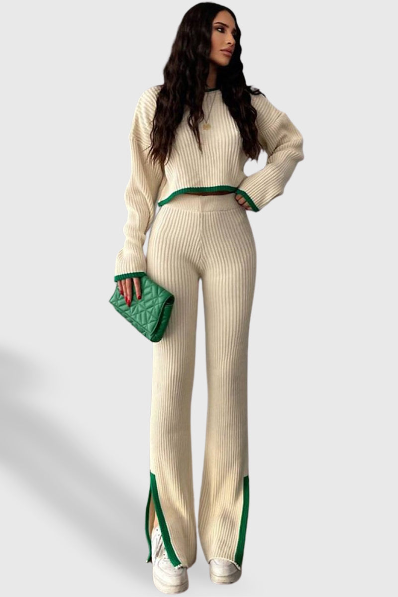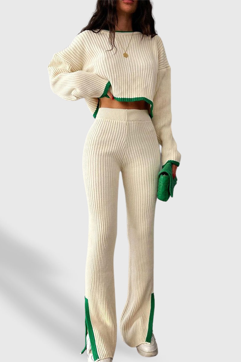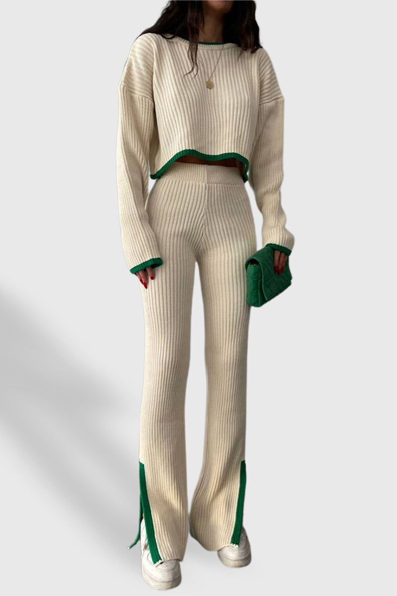 Tweedelige set met gebreide trui en broek. De trui heeft lange mouwen en een kort model. De broek is recht en heeft een split aan de voorkant. Beide stukken hebben een verschillende kleur voering aan de zoom.