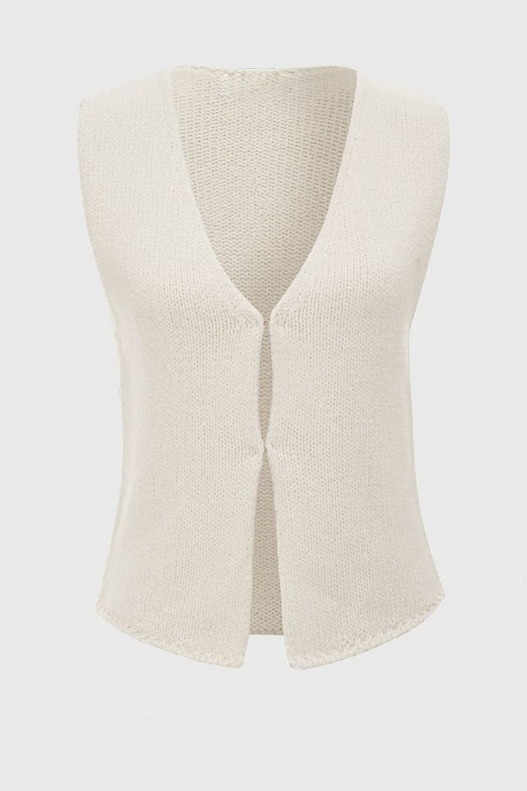 Mouwloos, gebreid vest van zacht garen met een minimale sluiting aan de voorkant en een V-hals. Het vest heeft een normale pasvorm.