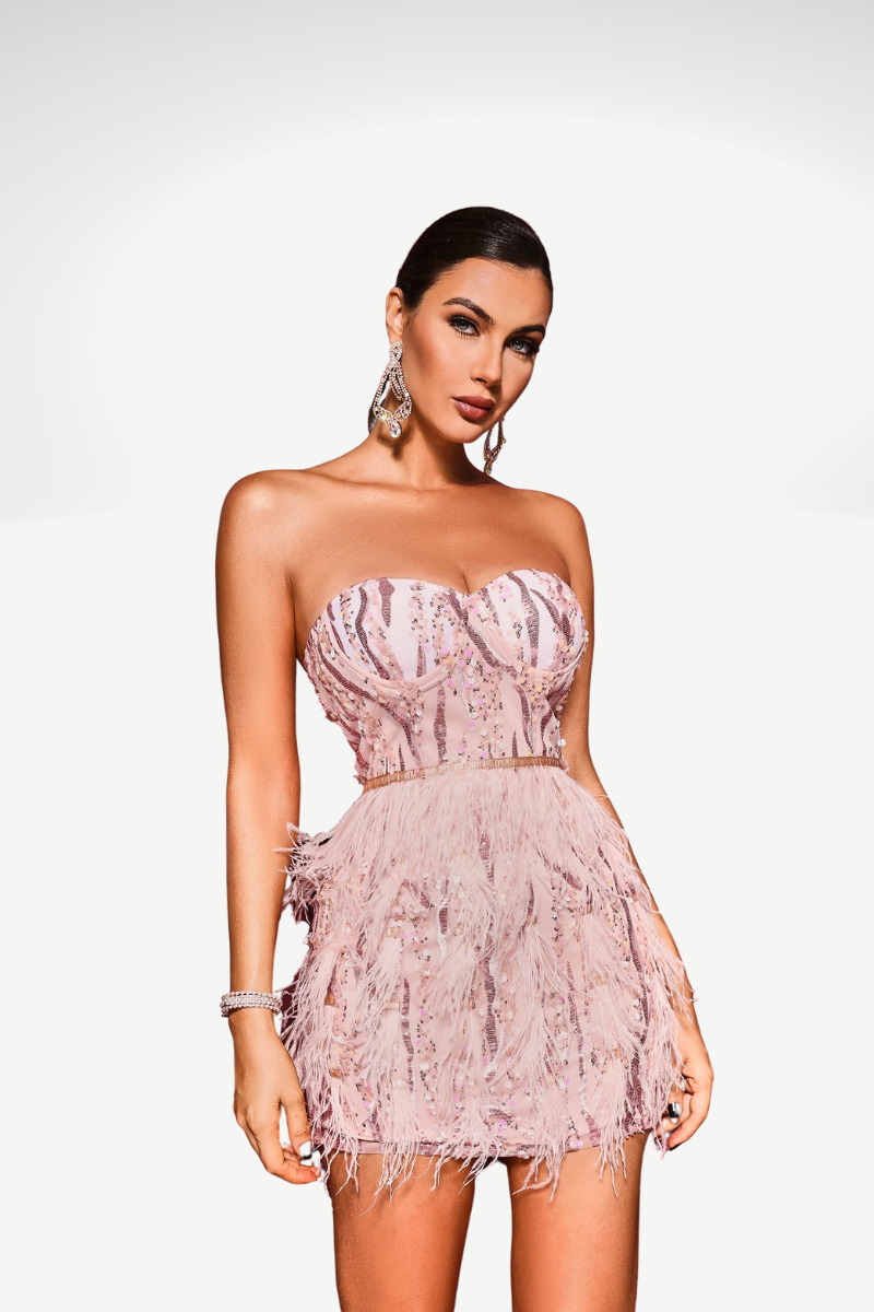 De perfecte combinatie van zowel vrouwelijk als stoer, de Lalia Mini Jurk staat bovenaan onze hitlijst. Met een stoffige roze tint, een veren rok en een met lovertjes versierde top. Maak een verbluffende indruk in deze feestjurk! Voeg een paar strappy hakken toe om de look af te maken.