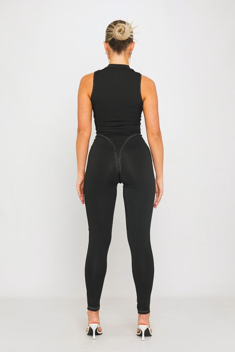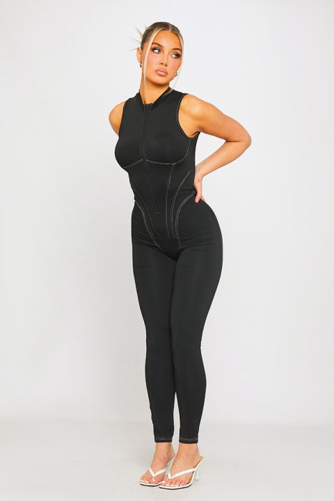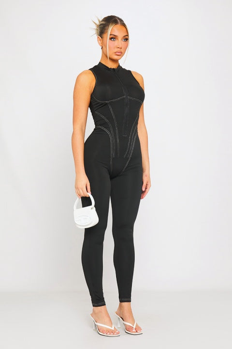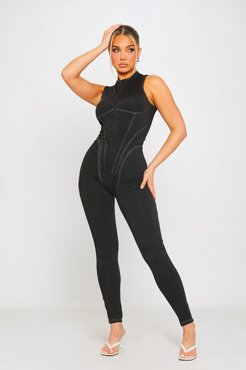 Shop de laatste modetrend met onze hoge hals corset zip detail sleeveless jumpsuit. Gemaakt van hoogwaardige materialen, heeft deze jumpsuit een chique hoge hals, trendy korset details en een handige ritssluiting.