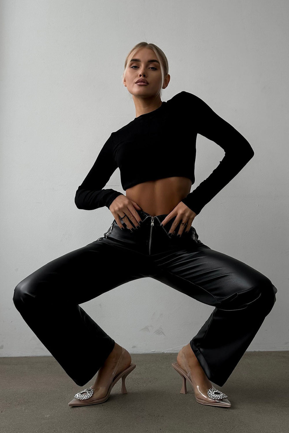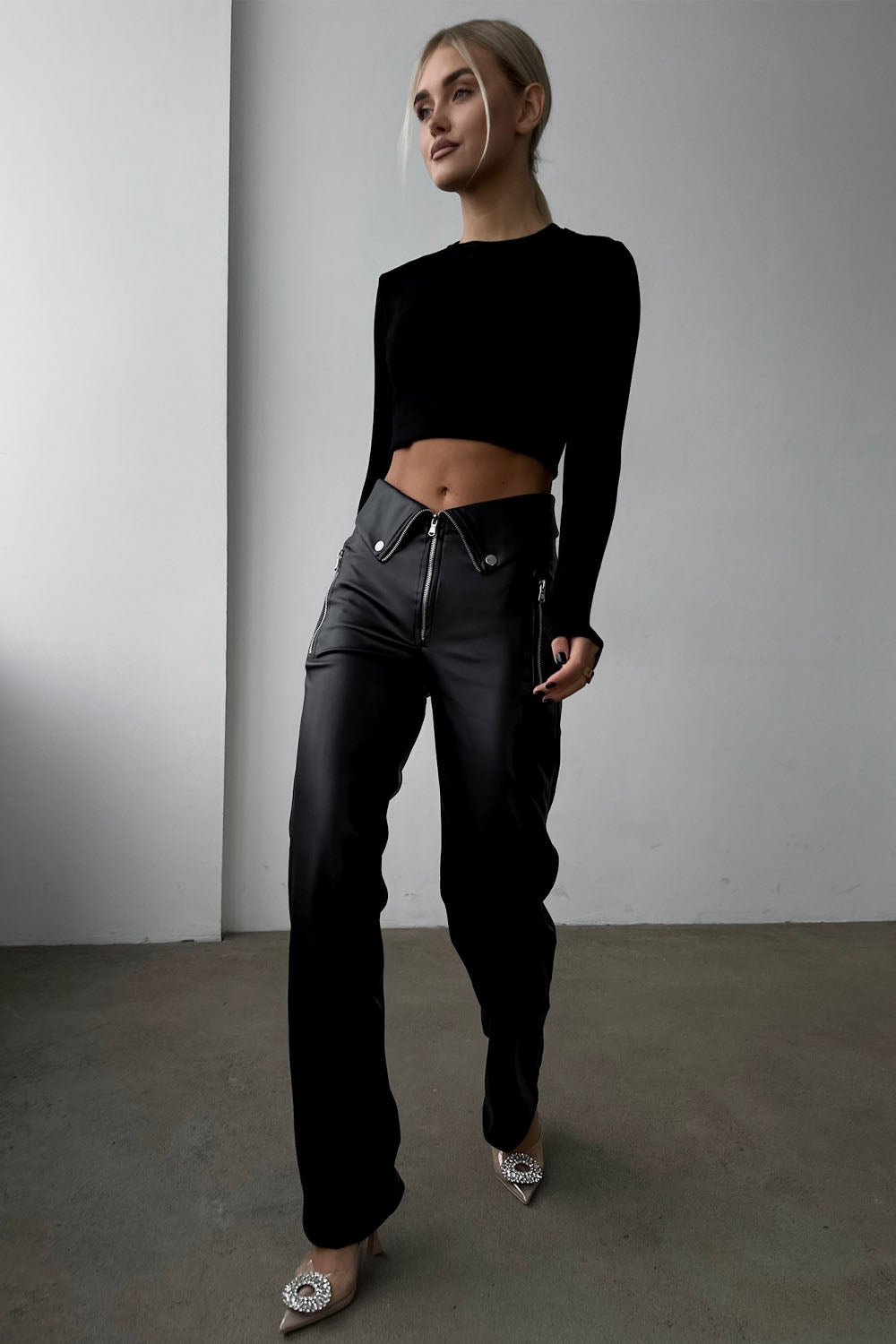 Pu leren broek met taille detail. De broek heeft 2 zakken en sluit door middel van een rits. Ze hebben een normale pasvorm.