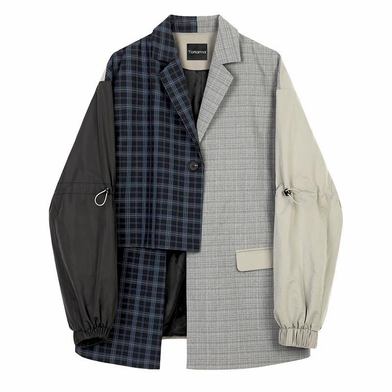 Deze prachtige edgy blazer is opgebouwd uit twee verschillende blazers met twee verschillende lange mouwen en heeft een asymmetrische split.