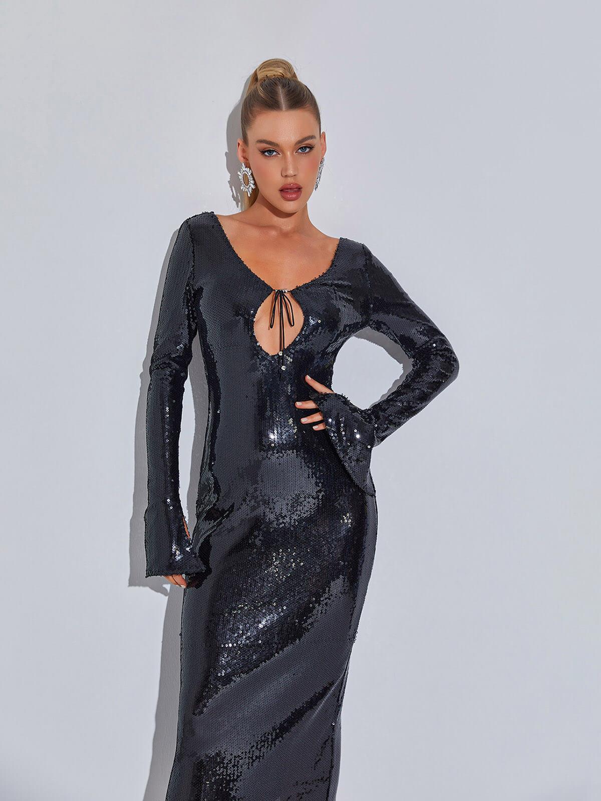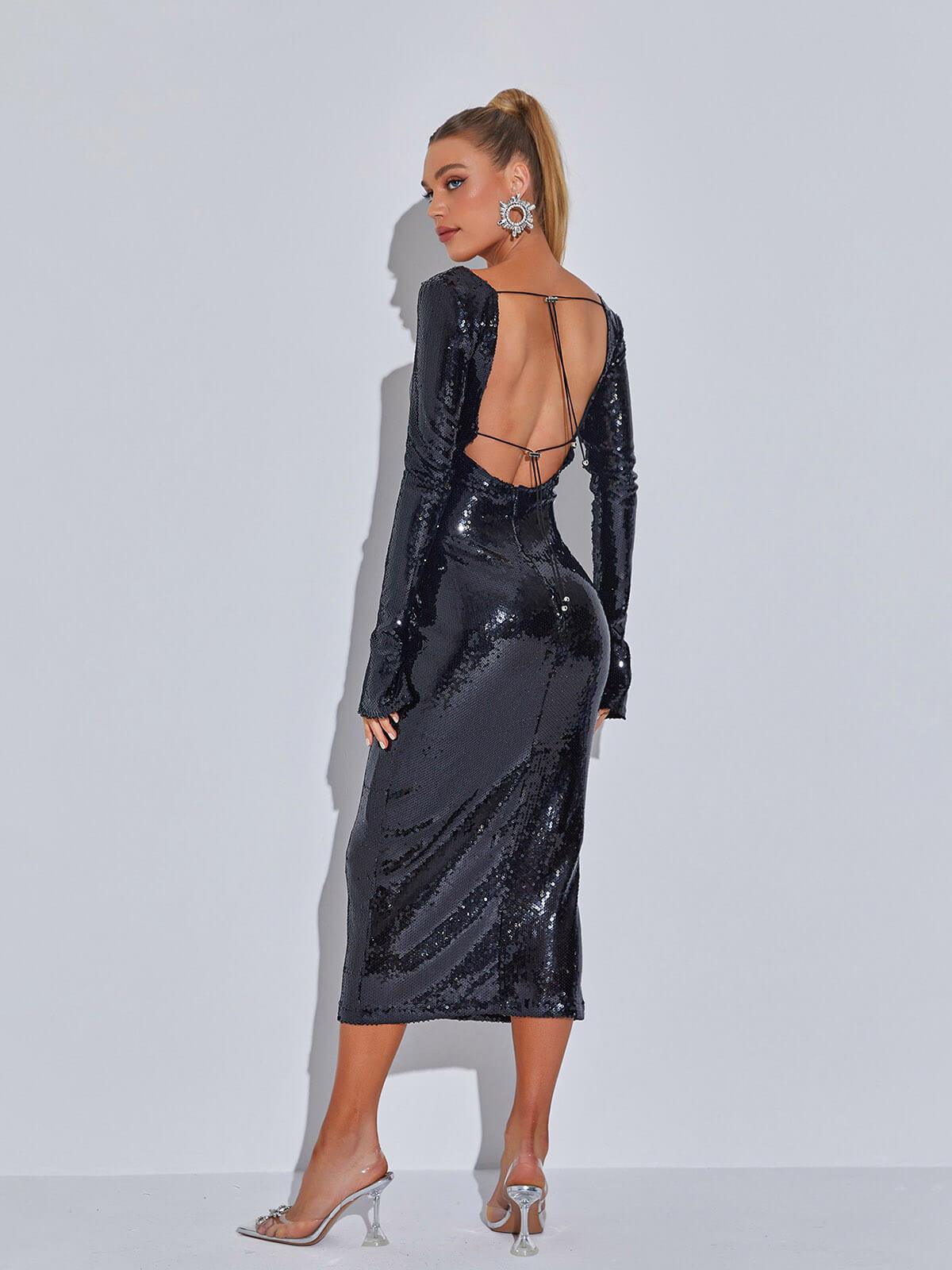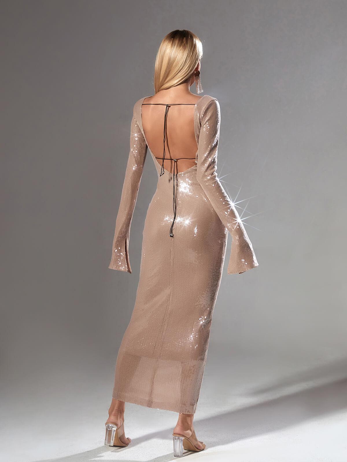 Deze Sian Sequin Backless Maxi Dress is het perfecte stuk voor formele gelegenheden, met een prachtige pailletten versiering, backless snit en lange mouwen. De maxi lengte voegt een elegante look en een verfijnd gevoel toe.