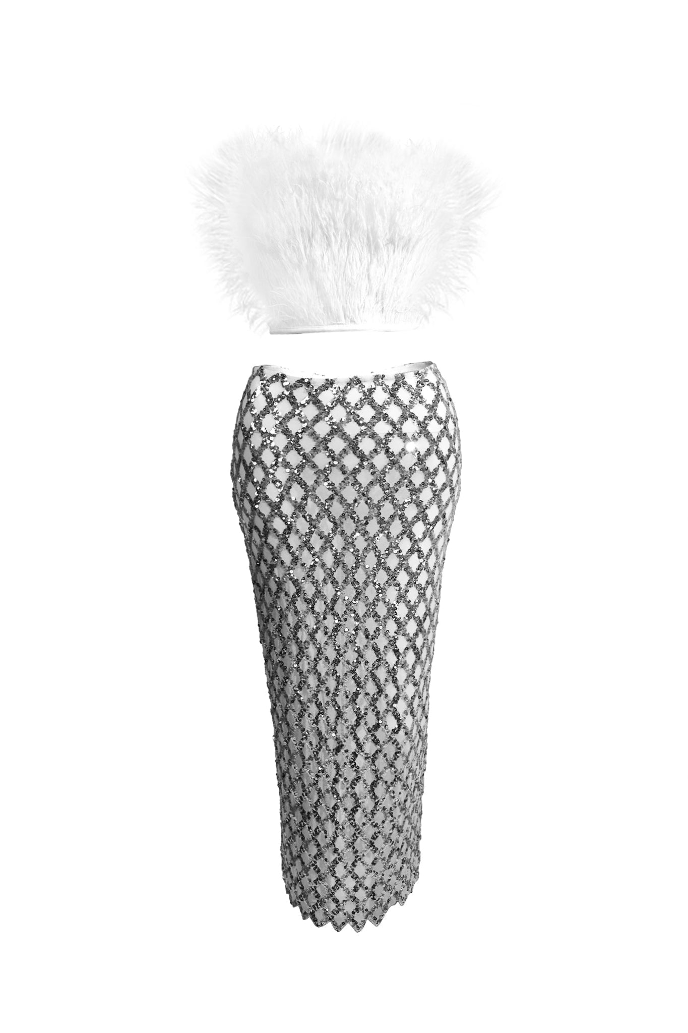 Gemaakt met veren, dit prachtige stuk combineert perfect met onze elegante pailletten maxi rok. Moeiteloos en stijlvol, deze tweedelige rok set is de perfecte trendy fit voor een avondje uit! Stijl met uw favoriete hakken en diamanten clutch.