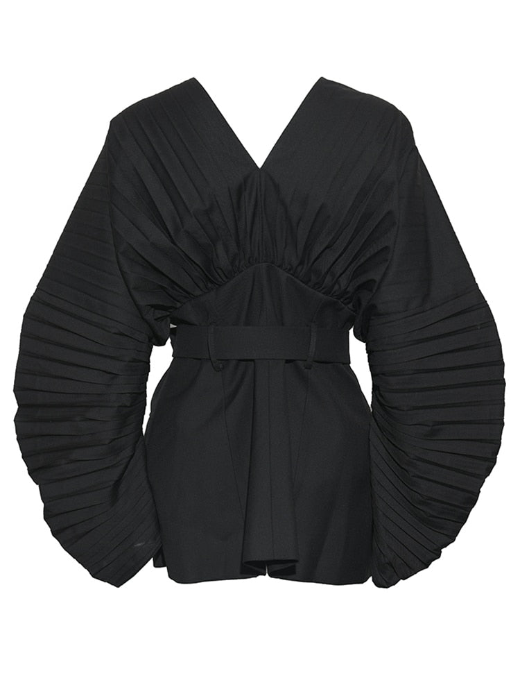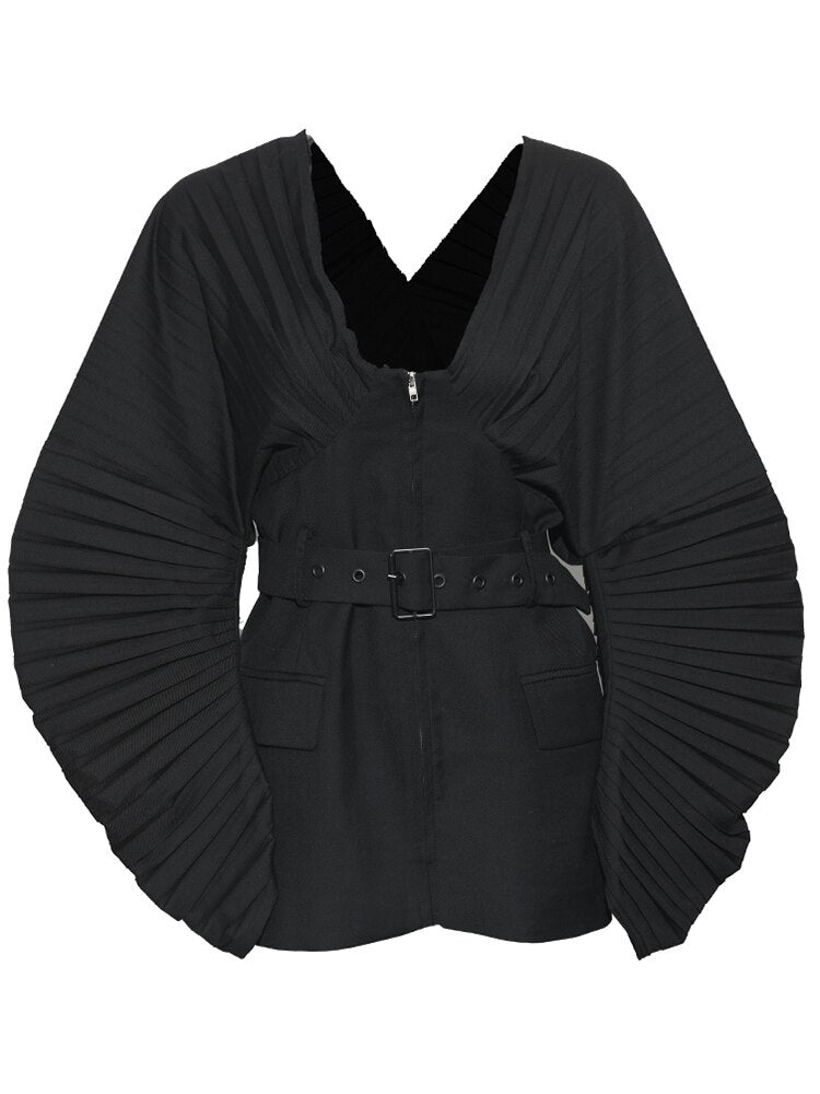 Een klassieke look met een moderne twist: deze zwarte geplooide jas met ceintuur voegt een opvallende stijl toe aan je dagelijkse garderobe. De getailleerde pasvorm en de ceintuur in de taille accentueren je rondingen, terwijl de vrouwelijke bovenkant zorgt voor een verfijnde afwerking. Het is een must-have item voor een tijdloze en stijlvolle look.