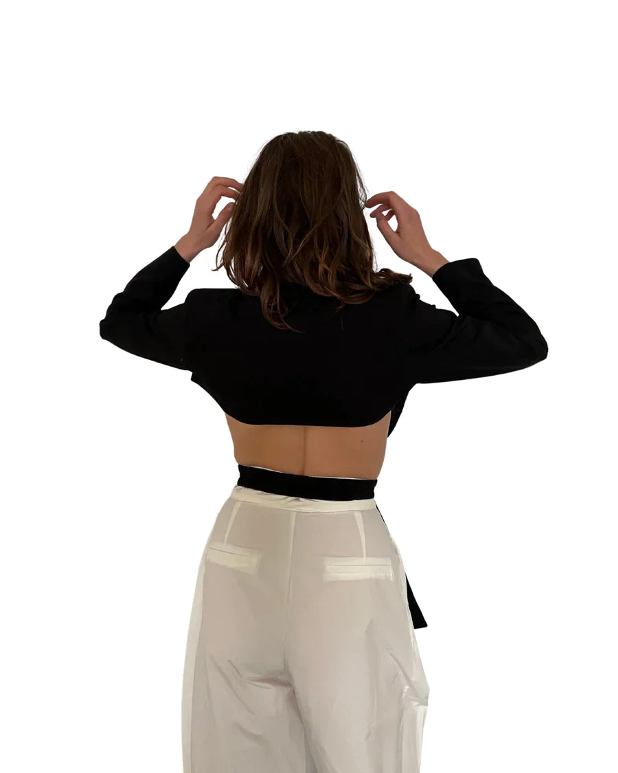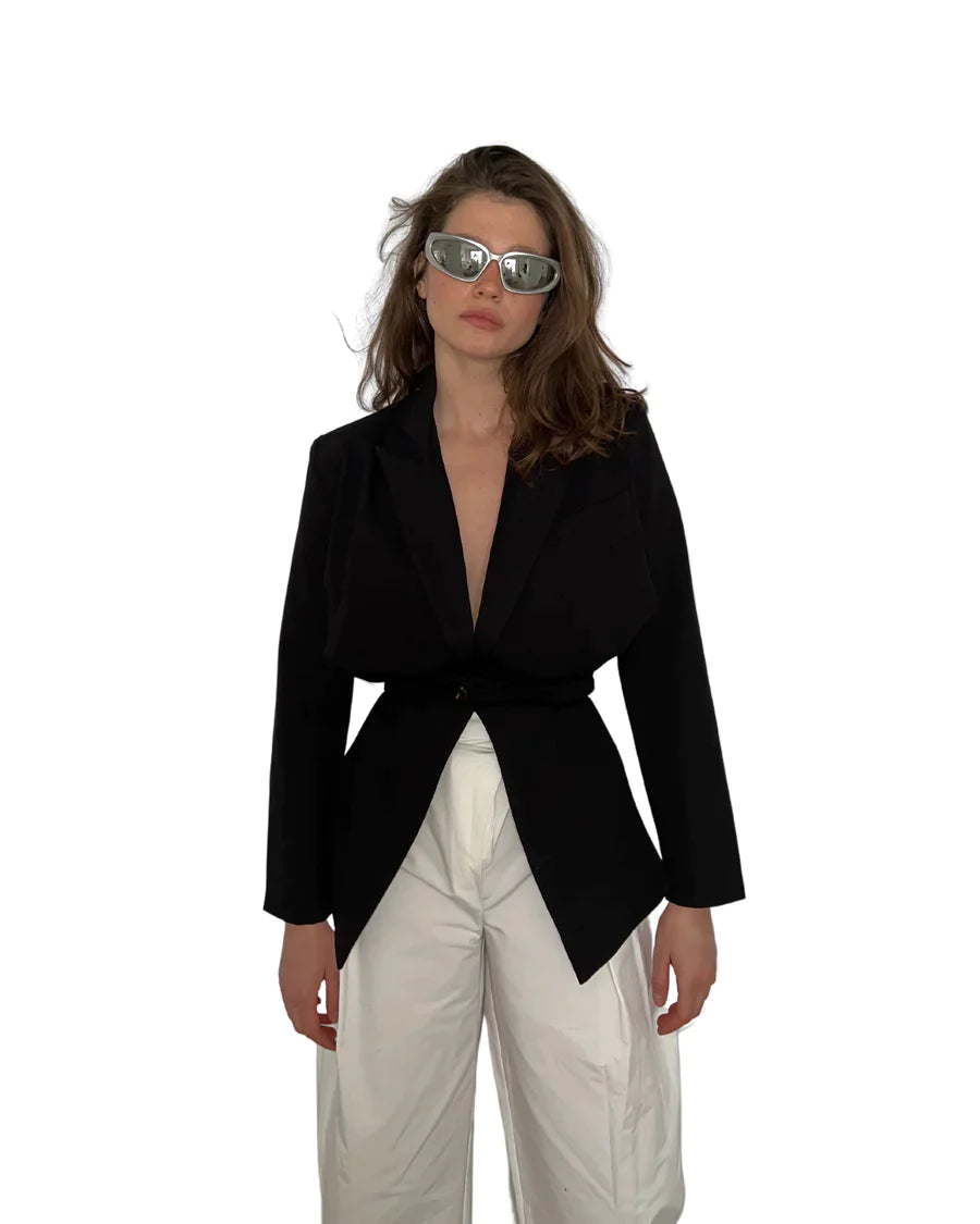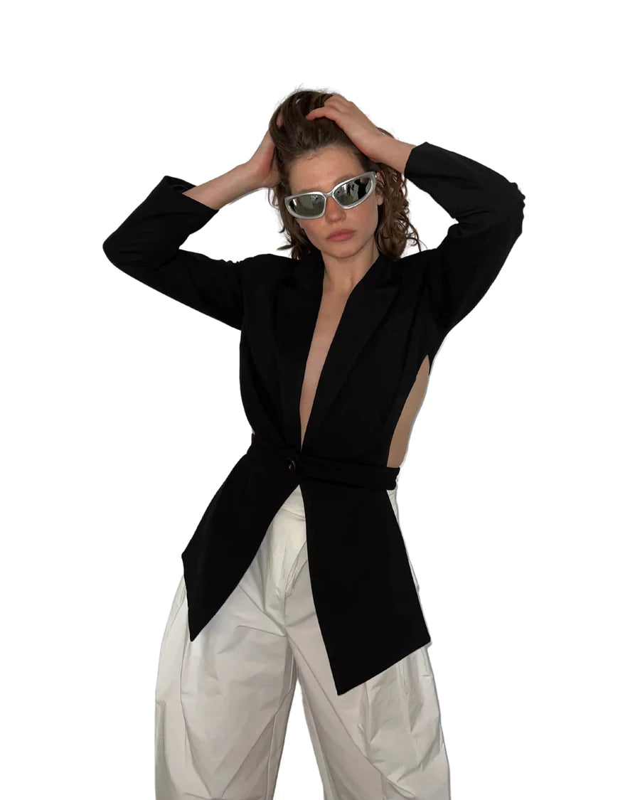 Dit is een See through zwarte blazer die single-breasted is en voorzien is van uitgesneden details.