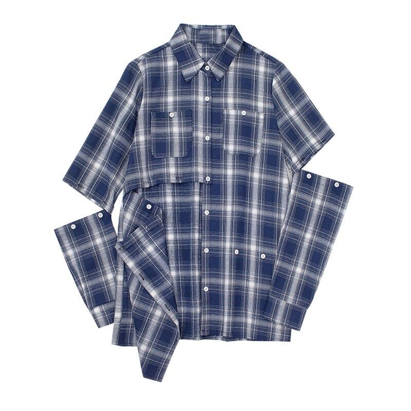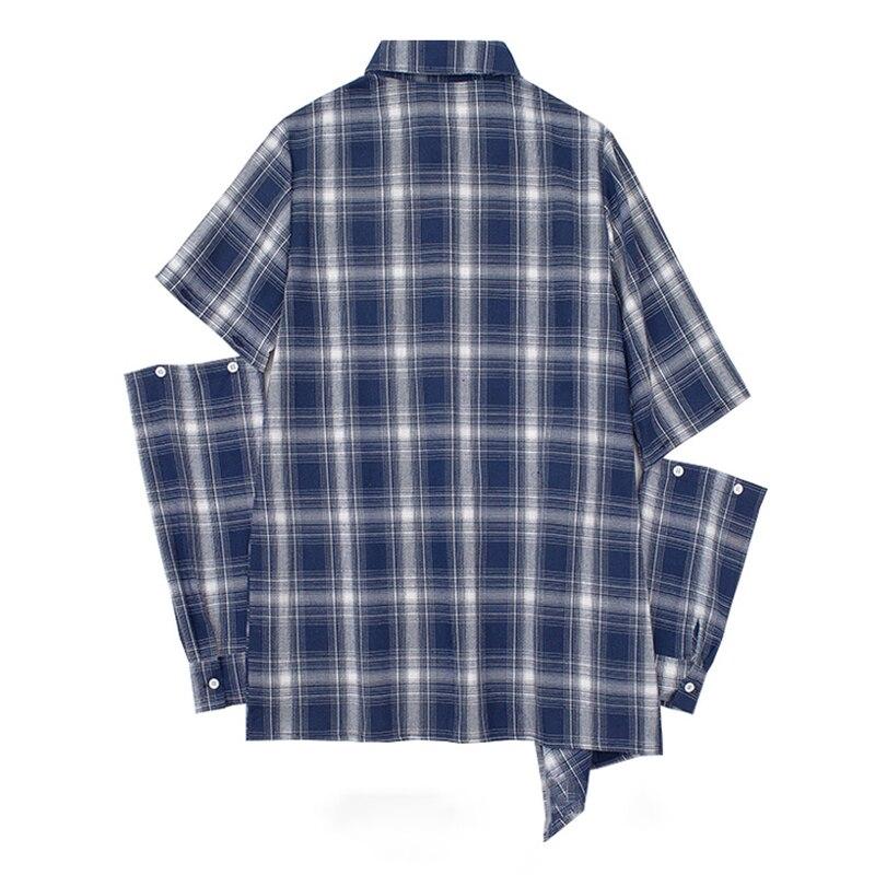 Dit is een geruit patroon top die ellebooguitsparingen heeft voor een dynamische uitstraling. Het heeft een kraagvormige halslijn met knoopsluitingen aan de voorkant.